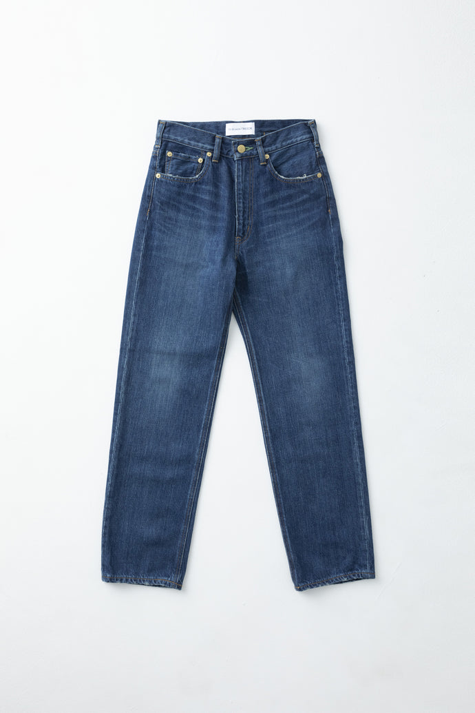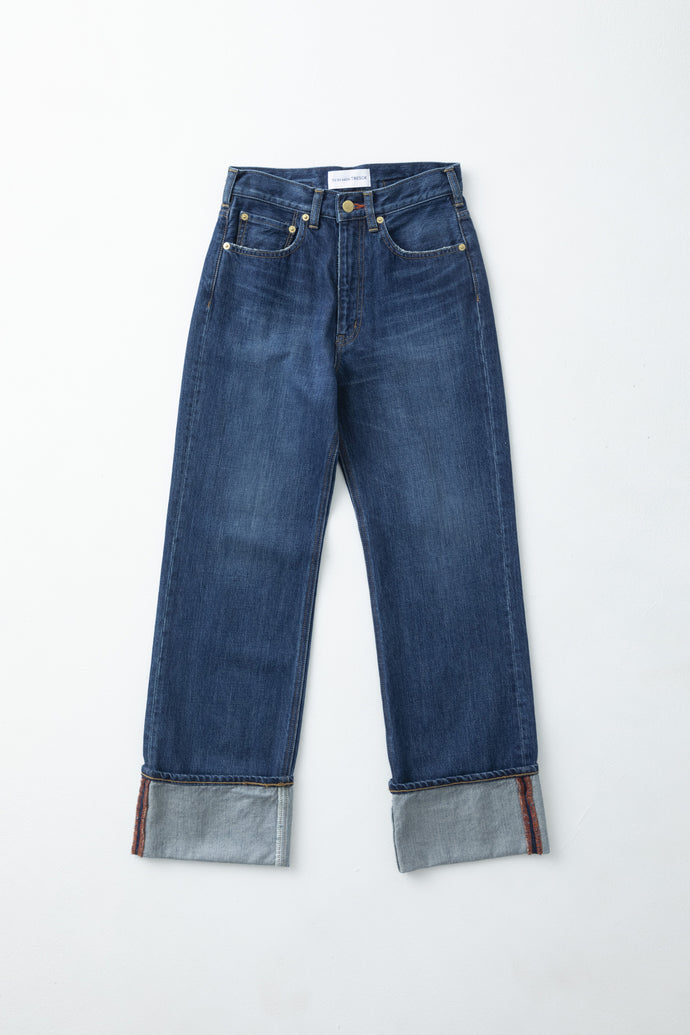 The Diamond Jean is inspired by 1940s blue jeans crafted from rigid, selvedge denim woven from hand-collected Zimbabwean cotton with using a vintage loom. This style is carefully faded and whiskered by hand achieving a coveted worn-in effect. They have a straight-leg, boyfriend-fit silhouette and high-rise waist detailed with signature luxurious gold plated buttons and a custom buttonhole stitch in diamond.